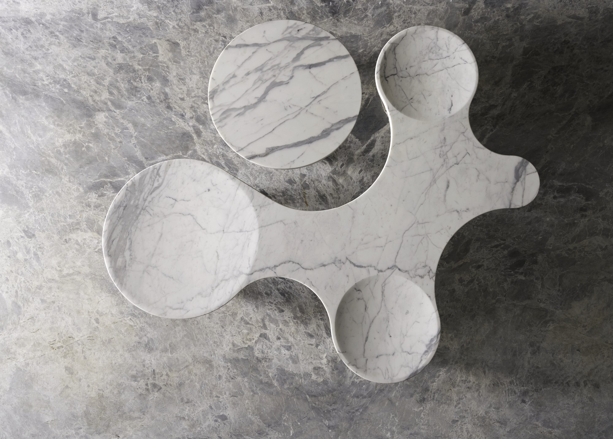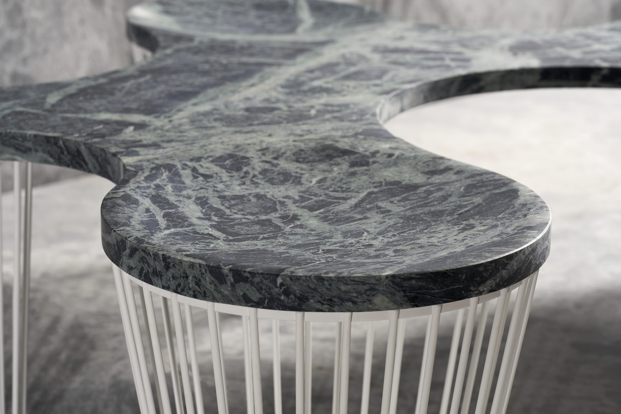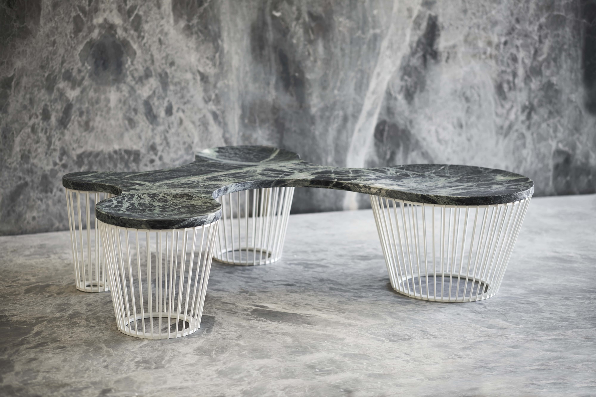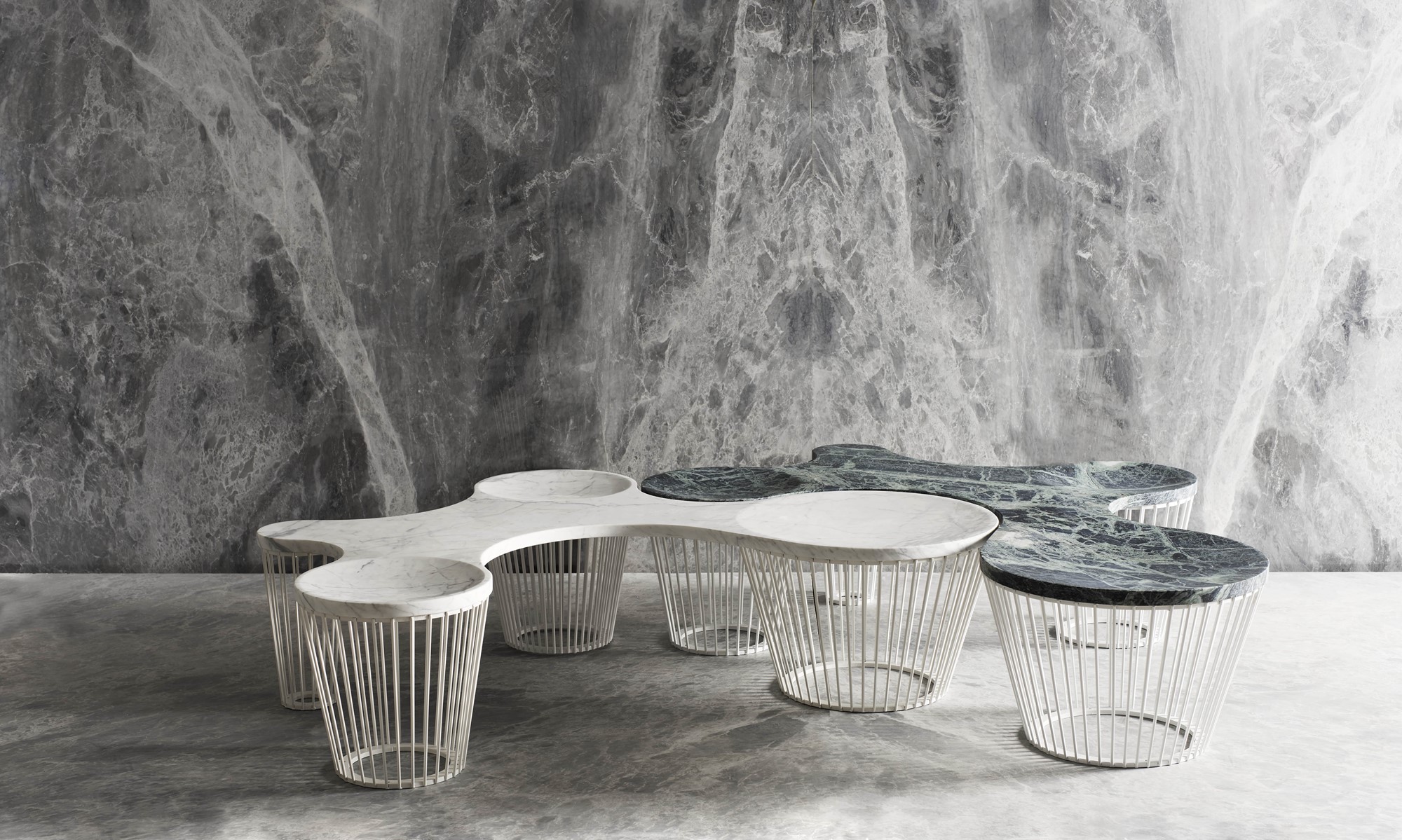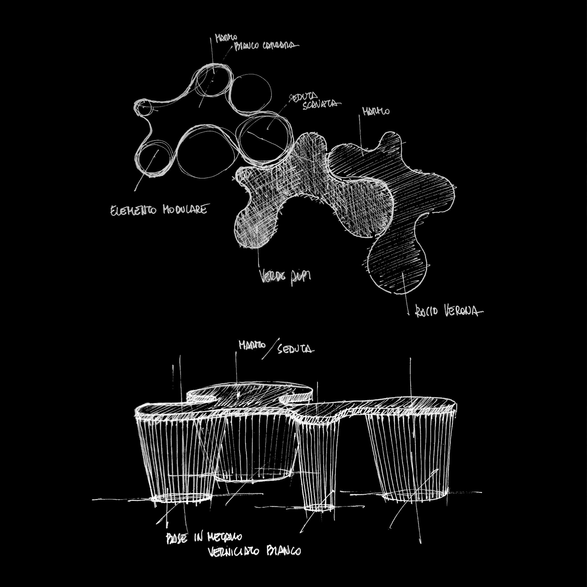 Independent units consisting of simple metallic frames and smooth marble surfaces create the free and consistent shapes of the SEATS seating system. Each element is independent and can be combined with other units of the same family to create continuous sequences on an organic growth matrix.